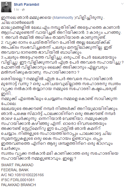 Shafi Parambil posted in his Facebook page that he had contacted Mammootty after hearing this Onlookers Media report about Lekha Namboothiri. Mammootty said to him that he will meet her very soon. Mammootty also expressed his concern that there are chances that people may misunderstood the news related to Lekha’s health issues.