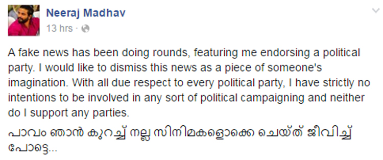 But Neeraj Madhav posted in his official Facebook page that the news coming in the name of his is a fake one. He not pledged any allegiance to any political party even though he respects every ideology. He respect all political parties and there is no intention to support any particular party. He had no intention to involve in political campaigns and other programs related election campaigns or something like that.