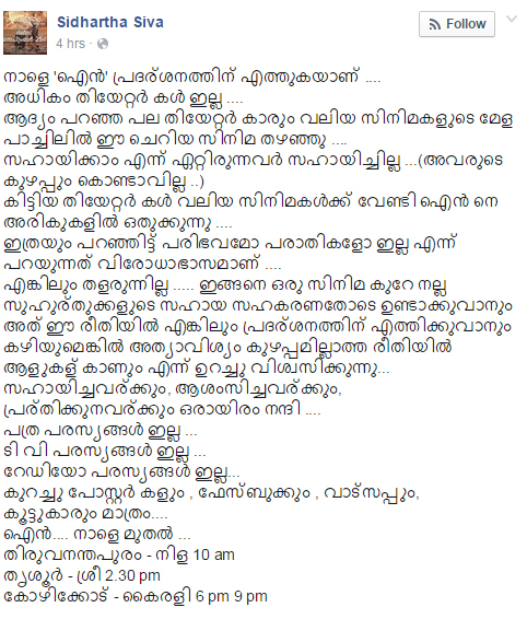 But he also said that there is not much theaters for this film as the theaters prefer only big films with lots of stars in it. They don’t bother to screen a national award winning movie which has no big stars in it. He also said in that status that there were people who agreed to help them in crisis but now it seems that they don’t even have the time to help them when the actual time came. But it may not be their fault and it might be their situation as such. Even though he had complaints about all this now he thinks that it will be the time for the audience to judge the film.